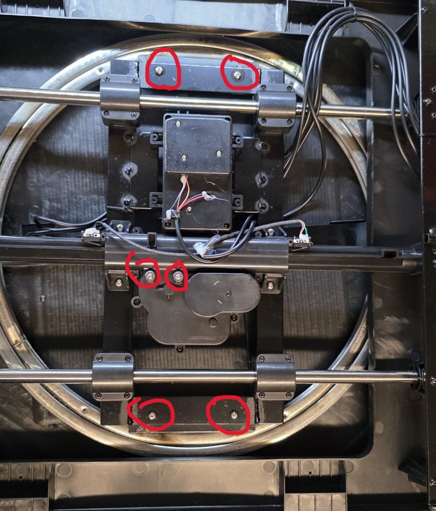 First, remove the four screws holding on the smaller round base and two bottom screws for the gearbox.