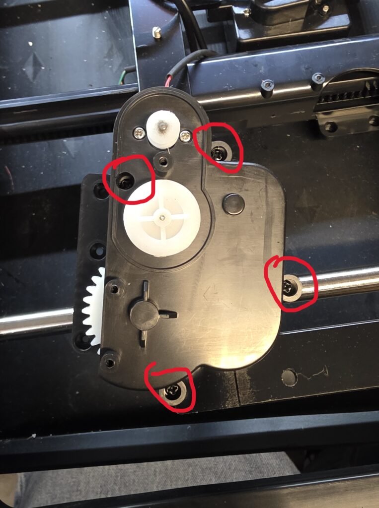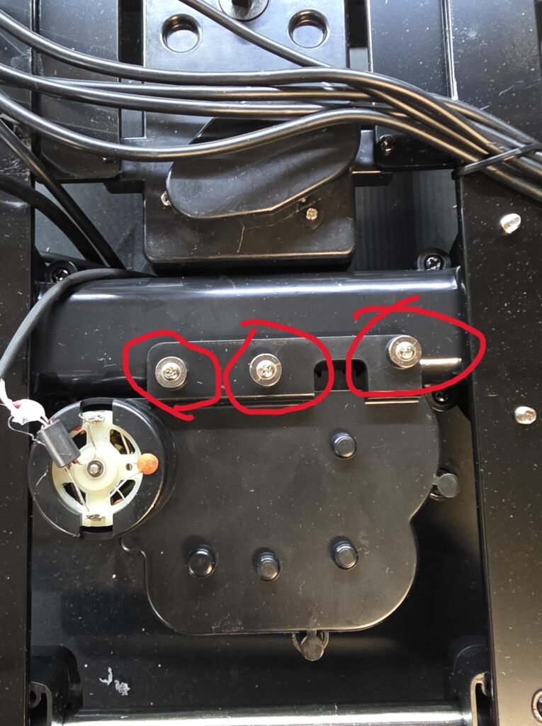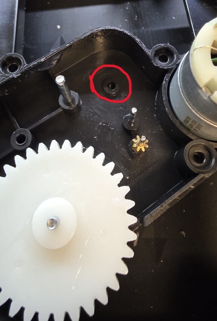 Next, flip over the base and remove the three screws holding the bottom of the gearbox.