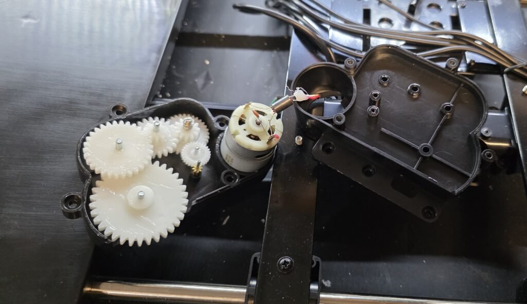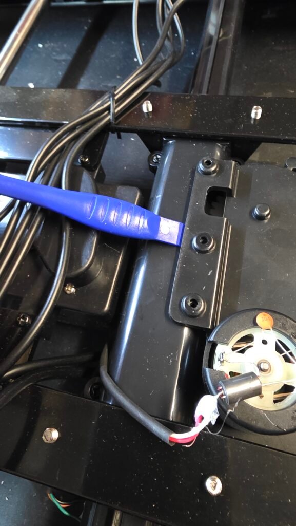 Lift the bracket for the gearbox to pop it off the headers so that it can be lifted up and removed. Use caution when manipulating the gearbox that you do not break the wires off the motor.