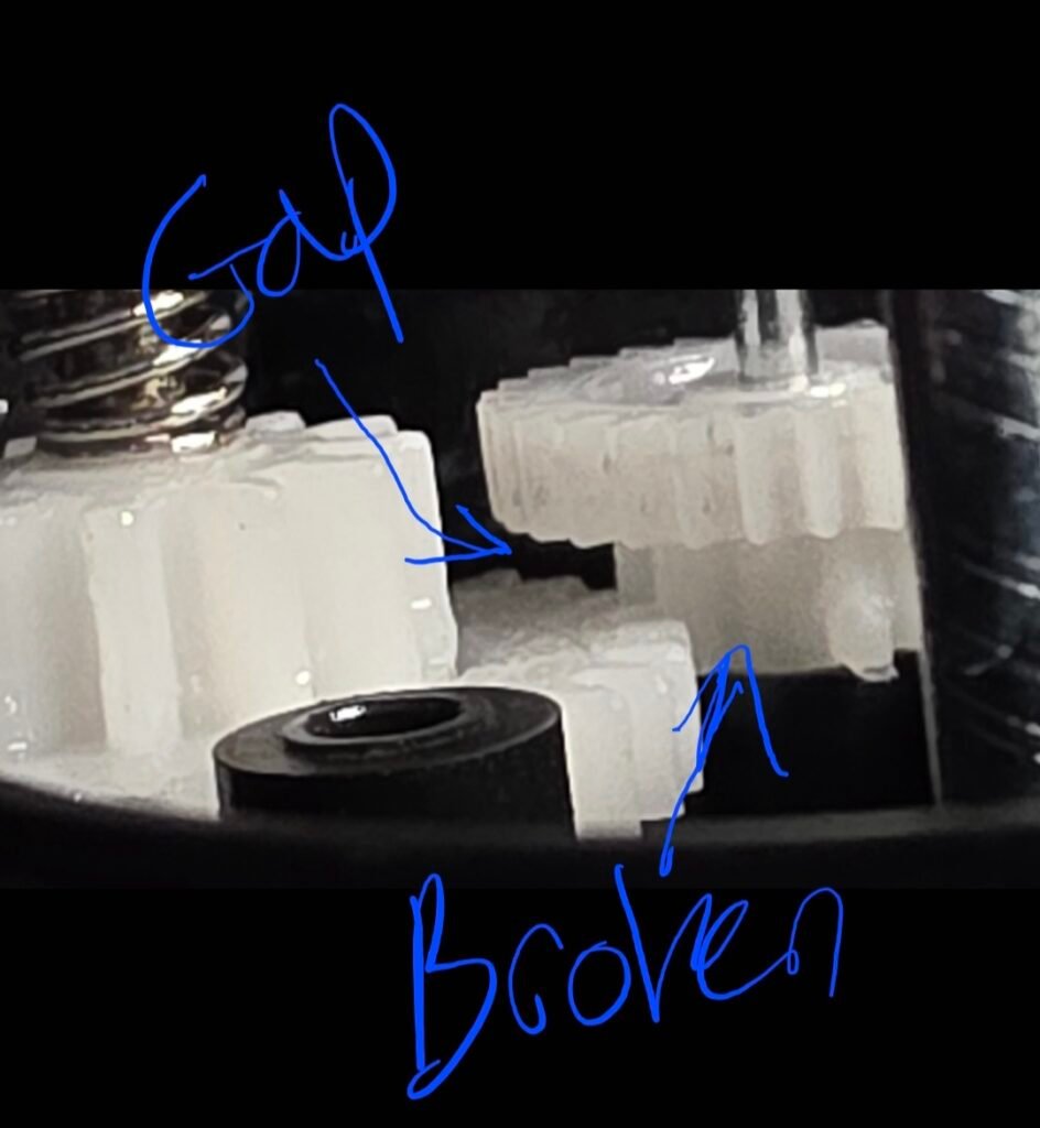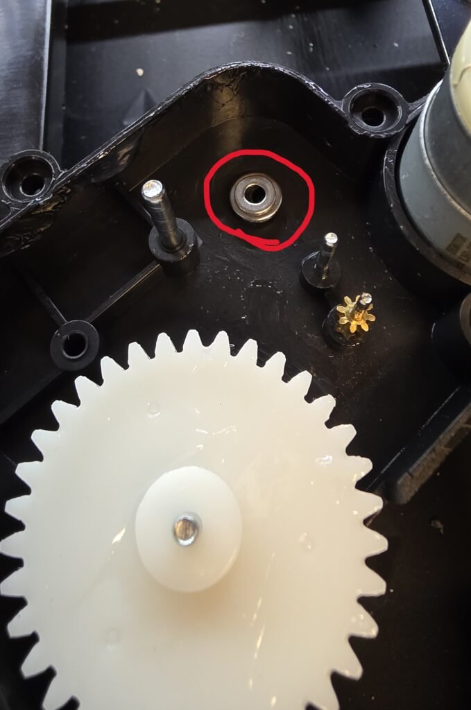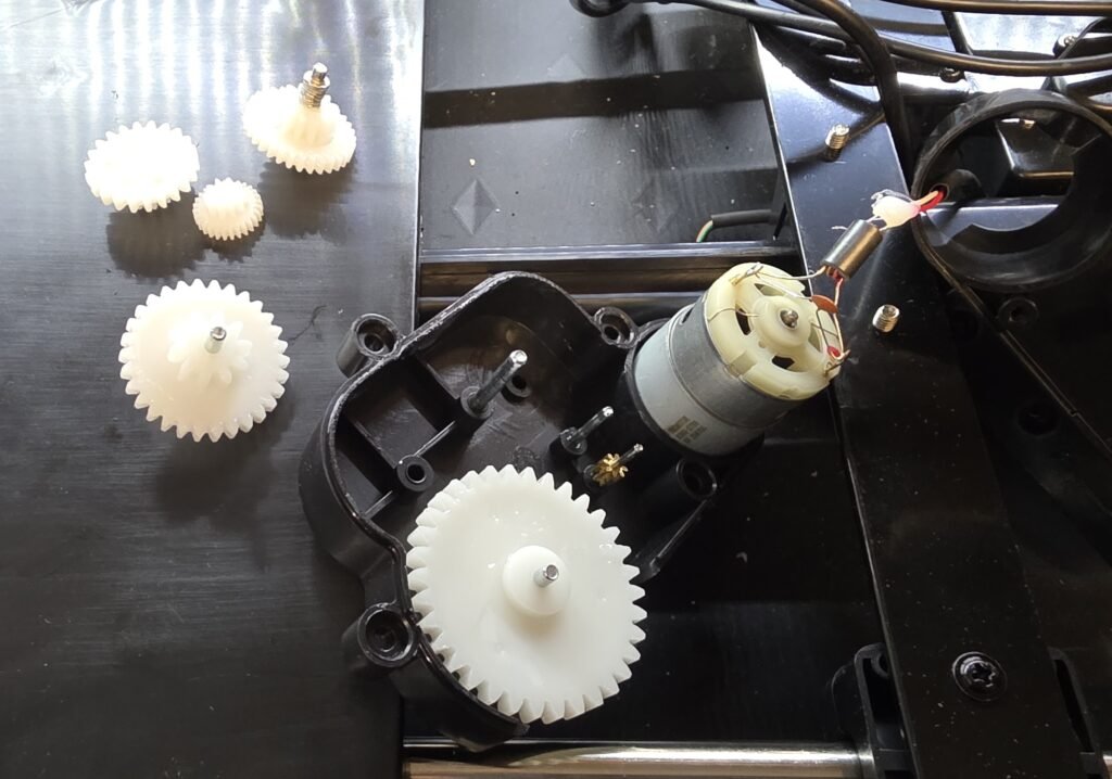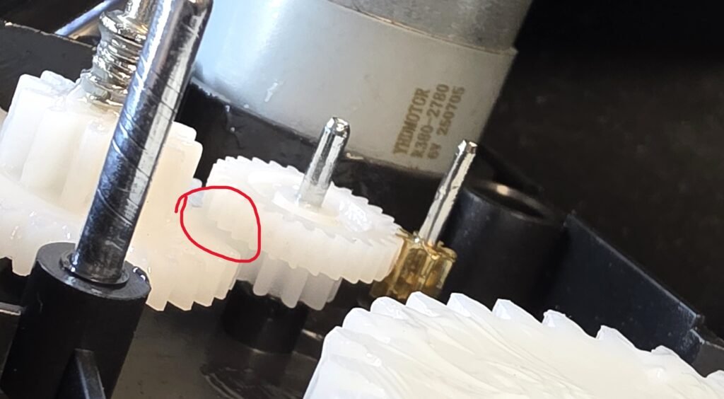 Remove all of the white gears and set aside in a clean area. Some gears will be snug, rotate them as you lift to make it easier to remove. If your base is already clicking, look for and clean up any broken gear teeth. Hopefully they are not damaged too much to continue. I have not yet found replacement gears.
