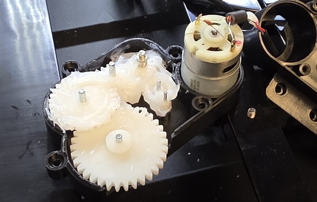Apply a liberal amount of grease to the internal gears, you dont need to add any to the large gear as this may get on your floor.