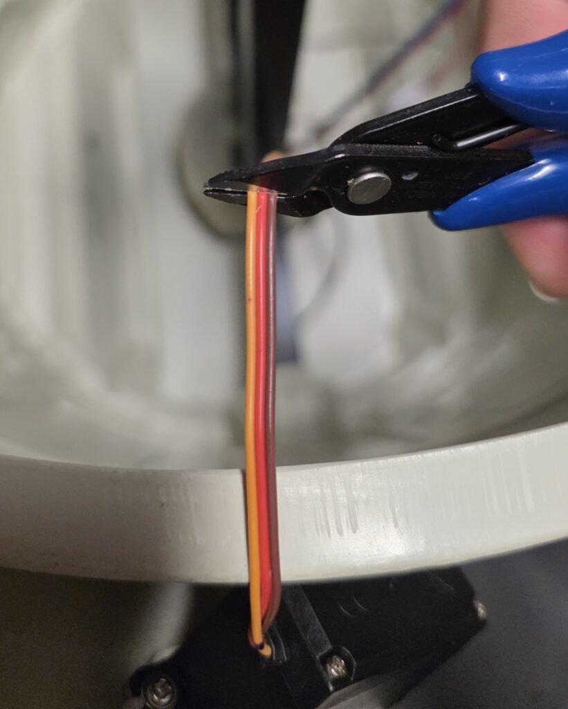 Next, cut the servo wire, we will be attaching a connector to allow easy connectivity of the replacement servo.