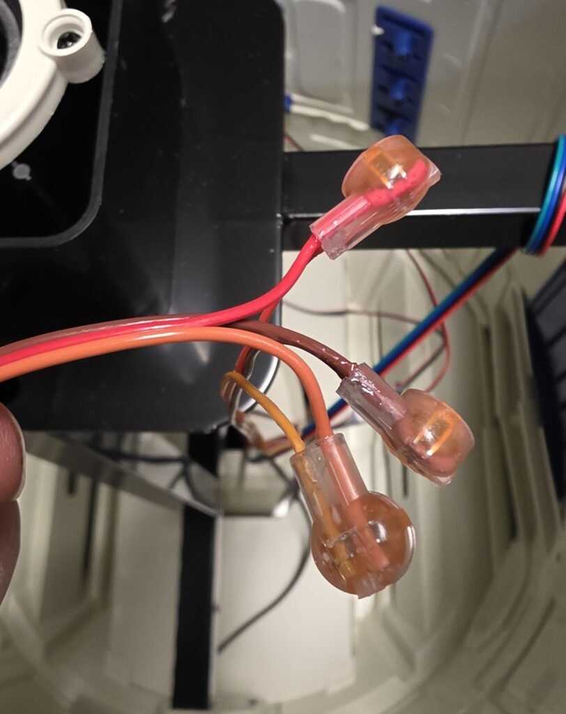 Start connecting the wires, the colors do not matter, just make sure that the middle wires connect to each other and that the wires are seated entirely into the splice connector…